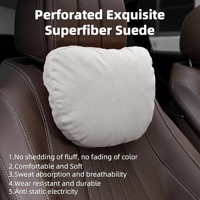 - 【High quality materials】: This headrest pillow is made of perforated and exquisite ultra-fine fiber suede leather as the pillowcase, with a layer of lining in the middle and filled with DuPont Sorona cotton.Three layer structure, easy to disassemble and clean.
