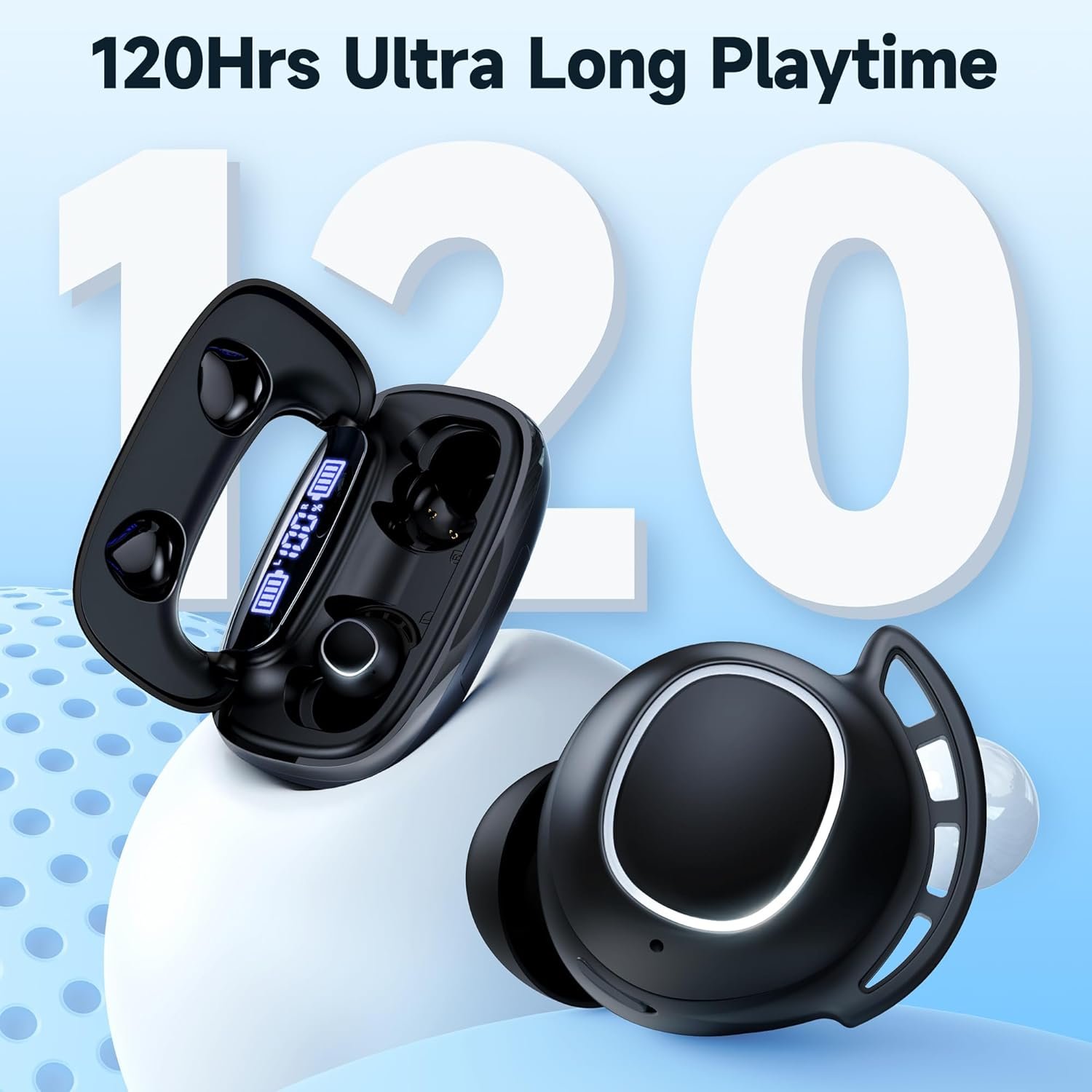 - 2600mAh Case and 120H Playback: The included charging case houses a large 2600mAh battery, enabling 16 additional charges for both bluetooth ear buds, resulting in a total of 120 hours of continuous playback.Each X18 earbud features a 35mAh battery, providing 7 hours of continuous music playback time.With 5 hours of daily use, the case provides a month’s worth of power without needing to recharge.The charging case supports USB-C charging and can be fully replenished in just 2.5 hours.