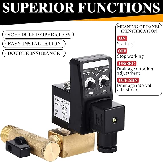 - Timing: the automatic timed water tank is flexible and can be programmed; The matching conditions can be achieved by discharging condensate at regular intervals; The drainage time: 0.5 – 10 seconds, the interval time: 0.5 – 45 minutes; You can also adjust the drainage duration and drainage interval according to the actual situation