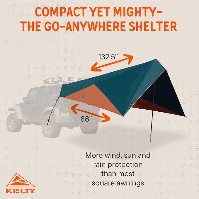 - CAMPSITE HQ: Equally at home on the beach, at a festival, or at the campsite, The Kelty Waypoint Tarp stands ready to protect you, your friends and your gear. Over 120 Square feet of coverage from sun, rain, and wind