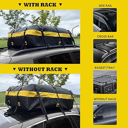 • – UNIVERSAL FIT: Designed to accommodate all vehicle types, our roof bag utilizes extra door hooks, making it a versatile choice for small cars, large SUVs, and everything in between. This adaptable rooftop cargo carrier is the ideal solution for your travel needs. This cargo carrier for top of vehicle provides ample storage space for all your luggage, camping gear, or sports equipment. Maximize your vehicle’s capacity with our innovative rooftop solution, perfect for vacations, road trips, or outdoor adventures.