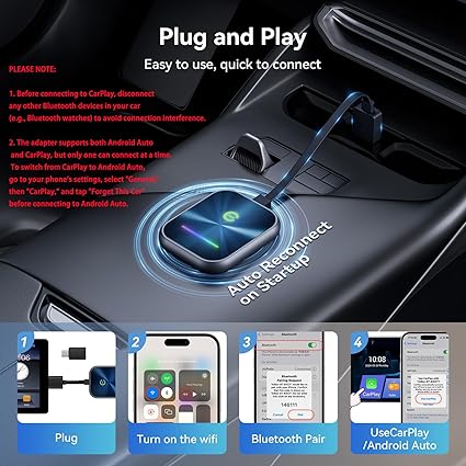 • Plug and Play, Smart Connection: Start using the Android Auto or wireless carplay quickly with just a 3-step setup, with no additional apps or drivers required. Once paired, the android auto wireless adapter automatically reconnects every time, whether your phone is in your pocket, backpack, or outside the car. Enjoy the convenience of seamless connectivity with just one setup!